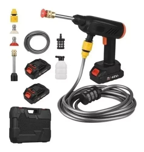 CARACTERISTICASBatería de iones líquidos 48V, diseño inalámbrico, fácil de controlar.-- Pulverizador directo de alta presión, pulverizador de ventilador y pistolas de agua multifuncionales pueden cambiar el tipo de agua en cualquier momento.-- Filtro fino de acero inoxidable incorporado, altamente efectivo y filtrado profundo de impurezas en el agua.-- Potente motor totalmente de cobre, parada automática y parada.-Portátil y de arranque automático, más rápido y más fuerte, filtro fino de acero inoxidable incorporado, altamente efectivo y filtrado profundo de impurezas en el agua.-Equipado con botellas de espuma, es más conveniente lavar el coche.-- Es muy adecuado para riego de jardines, riego agrícola, lavado de coches, limpieza del hogar, etc.Lavado de cochesEspecificación:-Color: negro. Material: Nylon + ABS-- Capacidad de la batería: 5 celdas (1 potencia: 15000mah/2 potencia: 30000mah) 10 celdas (potencia 1: 25000mah/2 potencia: 50000mah)-- Voltaje: 48w-- Potencia: 1500W. Presión: 70bar-- Flujo de agua: 3,5 litros/minuto-- Longitud del tubo de salida: 5m-*******PRODUCTO CON DOS BATERIAS*****EMBALAJECaja de cartónPapel burbujaVinipel negroCinta trasparente